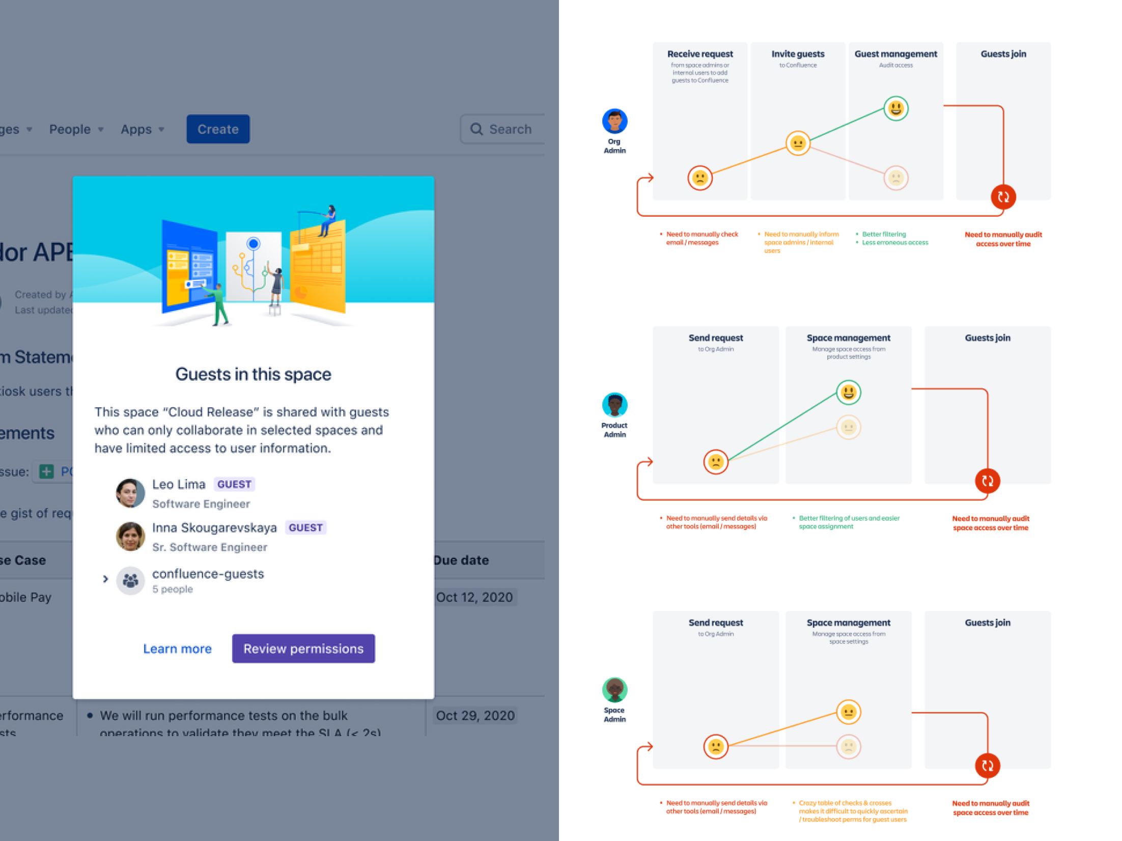 The EAP’s paid licensing sparked community debate, so I researched customer pain points and created empathy journeys focused on auditing guest access. Instead of a GA version serving only ~40% of users, I advocated for license-free, single-space Guests for Beta, reaching ~90% and aligning with Atlassian’s “don’t f*ck the customer” value.