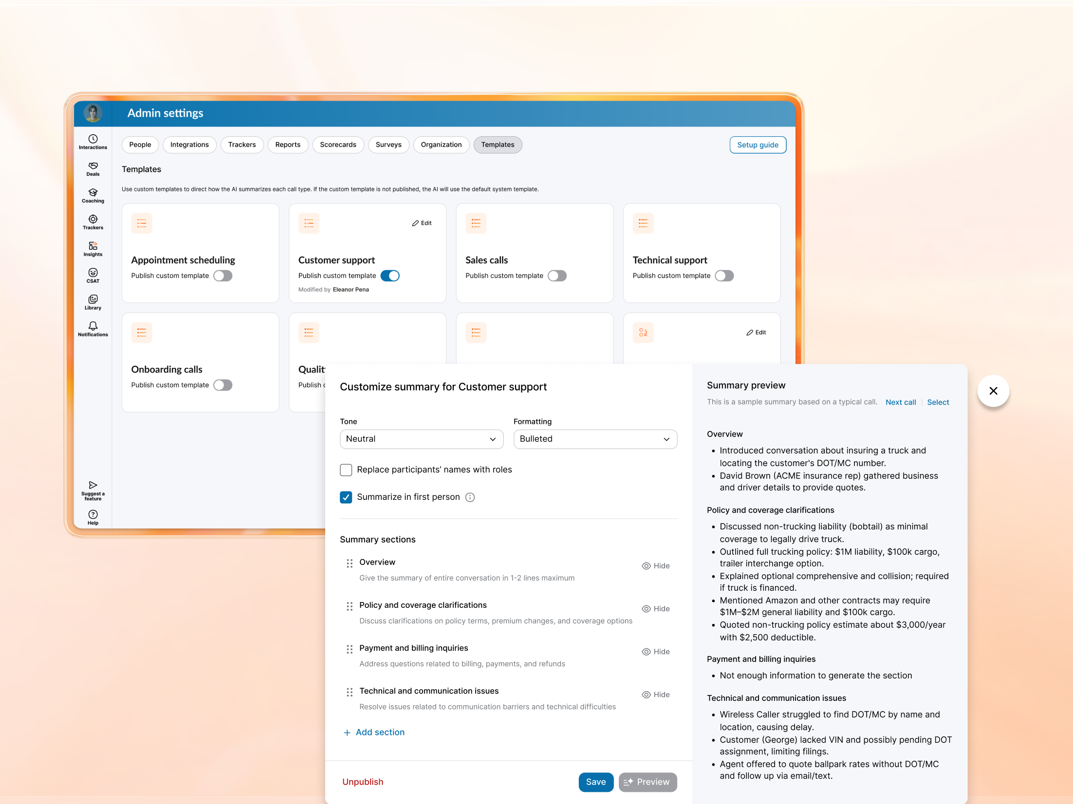Admins and managers needed call summaries customized for key call types, and agents required follow-up emails with tailored content.